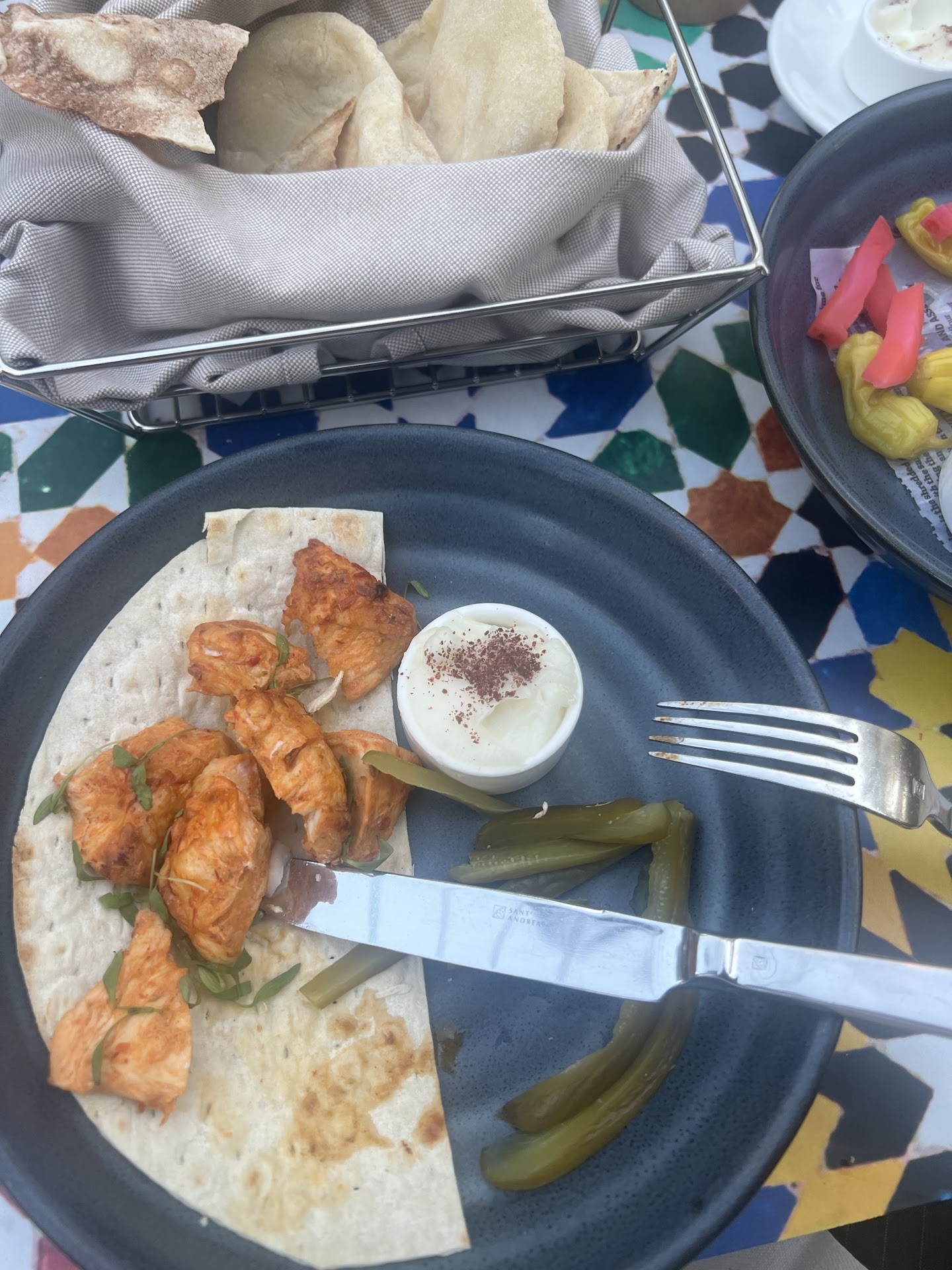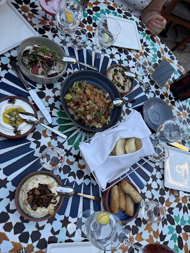 We moved inside and ordered a few dishes. One entree was beef shawarma, which was a very small portion, barely enough for one person. It looked exactly like a taco. We also ordered a dip, Muhammara, which was terrible and far spicier than it should have been. The bread was not the best for a high scale restaurant and we could not get out of there...