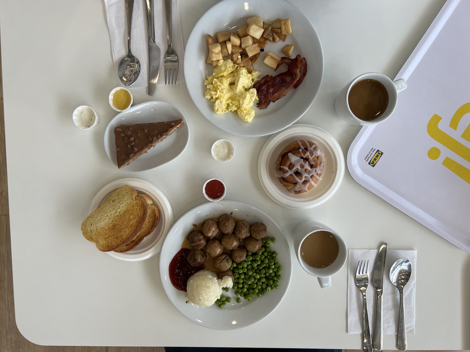 The prices are reasonable. The breakfast special is scrambled eggs, diner style home fries, and some bacon for $3.99! I didnât really like the scrambled eggs, it was too bland. I mean the expectation should be low đŹ The cake tho! Yum! So good. I can have it for breakfast, lunch, and dinner. There are no veggie meatballs served during the breakfast, just beef and sausage. The meatballs were good, and the side mashed potato was really good. Not the biggest fan of the cranberry jam. Definitely try the garlic bread. You get free coffee with IKEA family card! Overall you cannot go wrong with spending some...