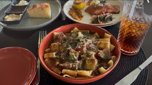 We had the bread basket with focaccia, whipped ricotta, tomato jam and garlic butter and it was really good (we were also relatively hungry 😅). For main, we got Nonna’s Spaghetti/Pasta and the meatballs were well flavored and tender. Per Mark’s suggestion, we also got the Rigatoni with lamb and short ribs in it and that was flavorful and hearty. For a protein option, we ordered the salmon and both of us really enjoyed this option. The salmon was tender with a slightly crispy exterior while the center maintained juicy. It was well seasoned and the veggies and onions that came with it were also very delightful and provided a wonderful crunch. All in all, we would definitely go again.