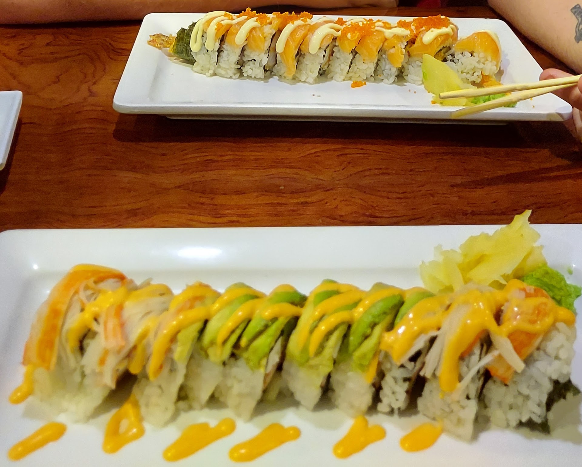 Me and my boyfriend went on a saturday night. This was our 1st time trying the place. First mishap....the hostess that was seating us didnt bother to ask us if were wanting to be seated at the hibachi area or regular dining. We just said we had a party of 2 and he told us it was a bit of a wait. About 10 minutes later another couple comes in and he asks them if they want hibachi or dining. After answering that they just wanted dining, they are immediately told no wait on dining and he shows them to a booth. When the hostess comes back we ask him why they went ahead of us as we were not waiting for hibachi seating either. In a frazzled state he seat us but puts us right by the smokey kitchen doors and a cold draft. Next our server comes to take our orders...he is quick with our drinks but everything else was a mess. We start our order with a couple appetizers and he wrote none of it down and waits for us to order our main entrees before taking any notes. When ordering we had to correct him and double check that he understood multiple times as he kept leaving items out. After our orders were placed we did not get one food item on our table for a good 45 minutes and when we did it was our entrees. No appetizer in sight. One of my sushi rolls was missing and my boyfriend recieved a roll he asked to leave off the avocado (he is allergic) but had avocado anyway. The waiter sends it back to replace but when it came back it had a horrible fishy taste and smell that the first roll didn't have. My boyfriend was sick later that night. We had also implied about my missing roll multiplle times...the waiter understood and said it was o the way. We finally ask again after maybe 15 to 20 mintes and are told he didn't know we wanted another roll and he had not put an order in for one! We both eventually grew tired of waiting for our food or rewaiting for orders to be redone. We called it a night and just left after eating what WAS brought to the table correctly. The food that was made correctly was good but this particular server provided HORRIBLE service. I dont think I would risk going back for that reason. We spent about 2 hours total for 2 bowls of miso soup and one sushi roll before giving up on the rest of our food and...