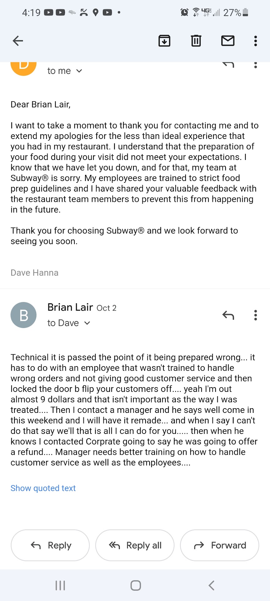 The kicker is that we placed our mobile order which was marked ready at 4:35 PM and we're still here at 5:29 PM. Meanwhile drive-thru customers who arrived after us are being served before us. And our sandwiches aren't ready because this poor girl can't do the work of 2+ people and be expected to be timely.