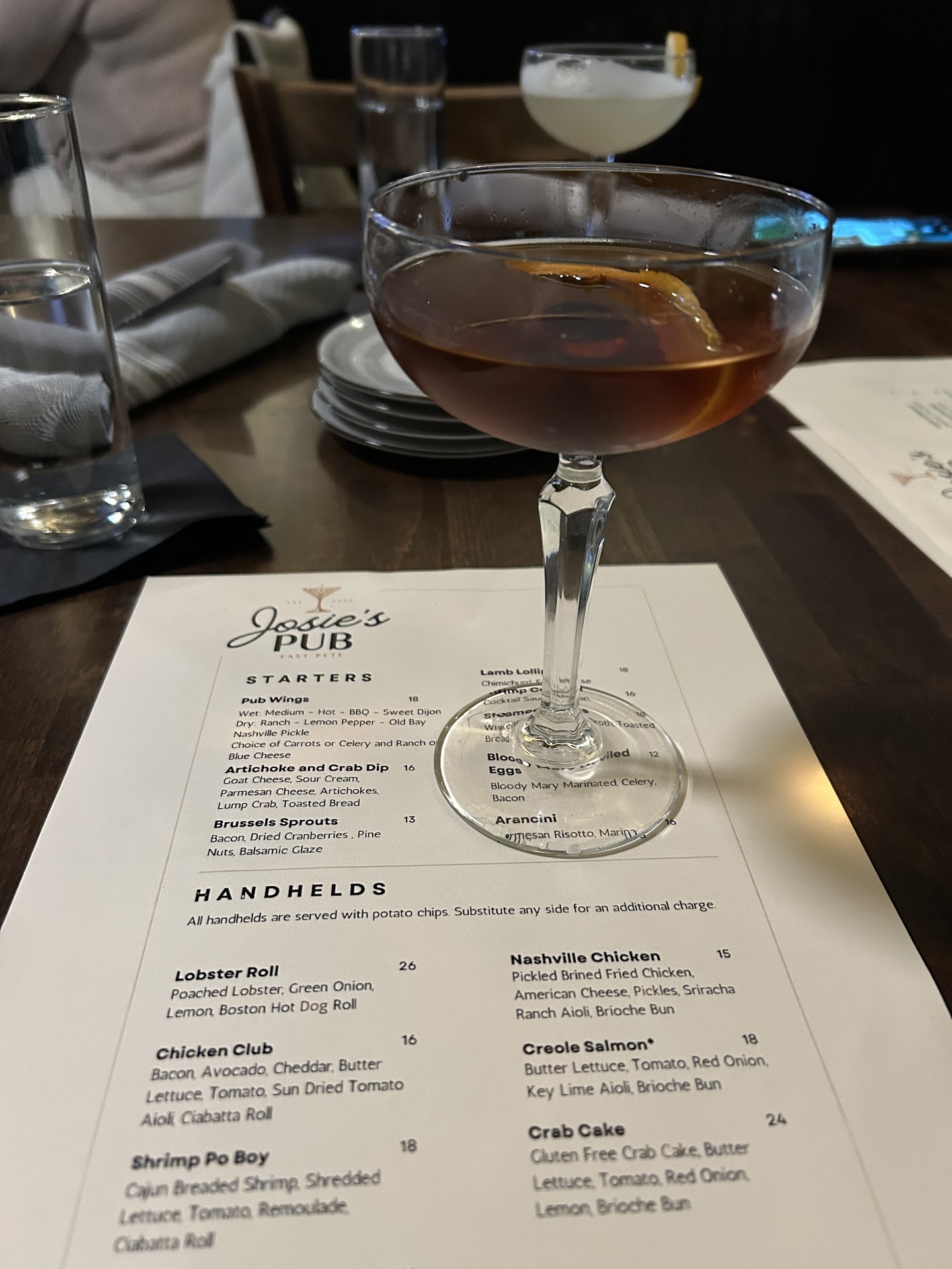 We have been waiting a long time for Josie's to open up, and we were not disappointed! Gorgeous remodeling inside(This restaurant was formerly Chauncey's) - Someone has a keen eye for aesthetics. The fact that this was the first full week of opening, but running quite smoothly is impressive. We were able to chat briefly with the owner and it's clear she's hand-picking staff and giving the entire venture her full attention. The Bartender is a true craftswoman. And I'm very sorry for butchering the spelling Michaela...? We had the Spiced Pear Manhattan - expertly balanced and delicious. One of the top 3 Manhattans I've ever had. The Pear Martini was also blended deliciously, not syrupy sweet. The "Stinger" cocktail was good, I personally felt the creme De Menthe was overpowering everything, too sweet - but that may be the intention of the mixologist. Our server Brendan was fantastic, very friendly and engaging. Made us feel like old friends. We weren't excessively hungry so we had 2 appetizers and a handheld. The artichoke dip was soooo good, very creamy and light, not thick and cloying like you see so often. I almost didn't go for it due to its commonality. The Arancini was very nice. The perfect amount of cheesy goodness. The Nashville Hot Chicken sandwich was solid, I don't partake but it's one of my wife's go-to sandwiches. I was very intrigued with some of the larger entrees and we'll definitely be back to try more things. If you're doing this well after a couple weeks, then Leadership/Team is doing...