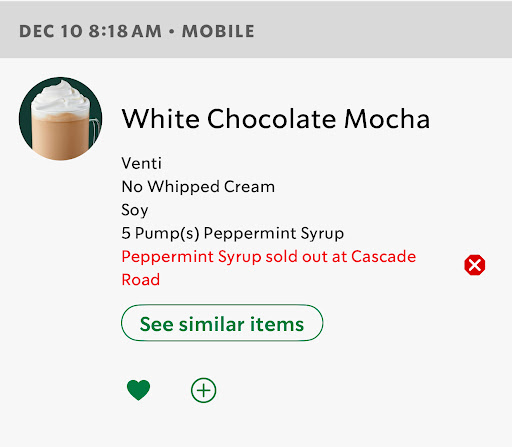 Two reasons for my post today. I have no issues with the staff. Theyâre always nice. Excellent staff just like any location Iâve visited. Of course, I did have some other favorite locations, but during the last 4 and 5 years of Covid. Baristaâs have come and gone. Congratulations to them. Number One. This location stays out of Peppermint Syrup. I think they get a re-up on Wednesday because thatâs when I usually see it. But by Monday itâs gone. I think they should double that order if itâs selling like that. Apparently Iâm not the only one who uses it. Same with Apple Juice. Itâs usually gone on Monday too, but it was available today. Number Two. Even though the Drive-Thru line is always long. Thatâs the only way I can get the Green Stick. Atlanta has the worst roads. Based on the pic I posted. My drink does not survive the drive to my destination. So, when you do pickup inside. Theyâve remove the Green Sticks. And the brown things to keep it from burning your hands. Hopefully thatâs just today or this week or the holiday season. Because thatâs usually available. But today it was not. As a Gold Card Holder for the last 8 years. It would be very appreciated to have Peppermint Syrup and just Green Sticks for your customers always. I want to be the one to enjoy my...