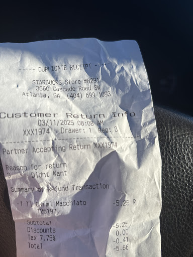 Read moreCustomer found plastic shreds in her coffee. However, the young lady had swallowed almost all her coffee before she sees it. She returns to the Starbucks in question 3660 Cascade Rd SW Atl, GA 30331. Of course management knows nothing about intestines or that shreds of plastic could poke a whole and cause get harm to the individual in question. Rude manners employees need to be fire or seriously retrained in language skills and how to deal with the public. You laughed as if you didn't care because you didn't. You never even tried to calm nor fix the issue in anyway. Which is why you should of been filmed also. Your reply to an upset customer was out of character and very unprofessional. You have been reported to the Corporate Office. I think I'll send my video over to the news as well, because it's clear this establishment needs a total rehaul everyone needs to be fire and a fresh crew brought in clearly you don't hold Starbuck SOP's or even emphany to anyone. This itself is very disappointing but when you hire individuals who are only there or collect a pay check instead of serving the customer as politely as possible. Get it together Cascade you are being watched it would be a shame to have a business revamped out of pure ignorance of staff...