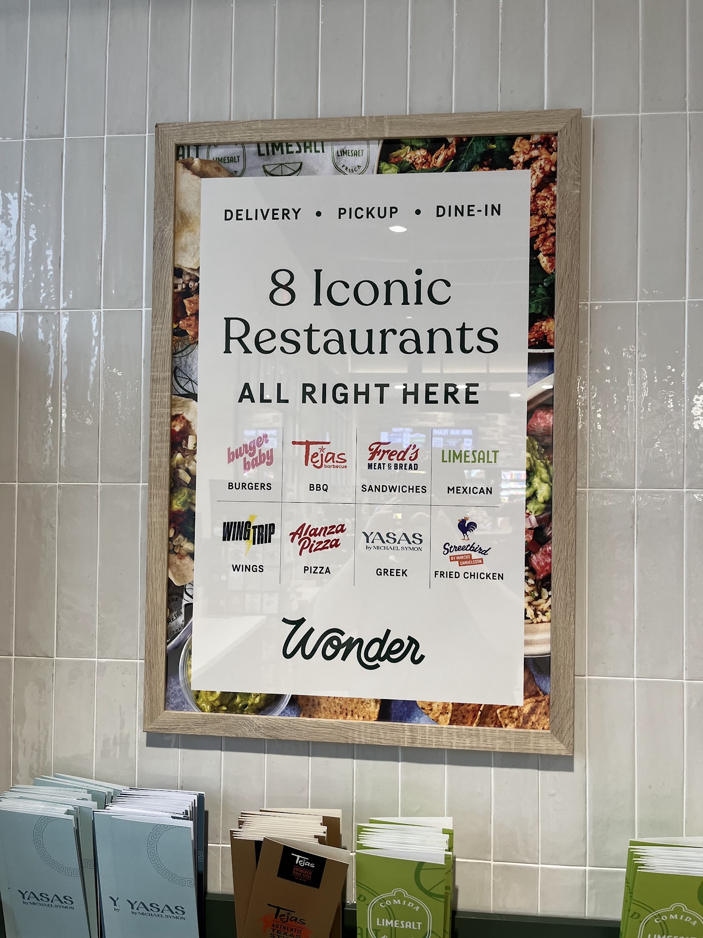 There are currently 9 menus available here at Wonder Food Hall, located inside the Cumberland Farms on Newport Ave in East Providence. The 9 menus are: Burger Baby (burgers), Tejas (BBQ), Fredâs Meat & Bread (sandwiches), Limesalt (Mexican), Wing Trip (wings), Alanza (pizza), Yasas by Michael Symon (Greek), Streetbird by Marcus Samuelsson (fried chicken) and Room for Dessert (dessert). These menus are currently available on the Grubhub, DoorDash and Wonder apps. There is a small pickup window within the store, some kiosks for ordering and seven tables for dine-in within the Cumberland Farms