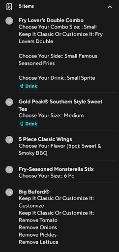 Depending on what time of day you visit, the drive thru lines can get a little ridiculous and depending on what you get, the food can be hit or miss. The Big Buford is almost always a safe bet for a fresh, tasty option. The wings, fish sandwich, etc that may not be as frequently ordered are hit or miss.