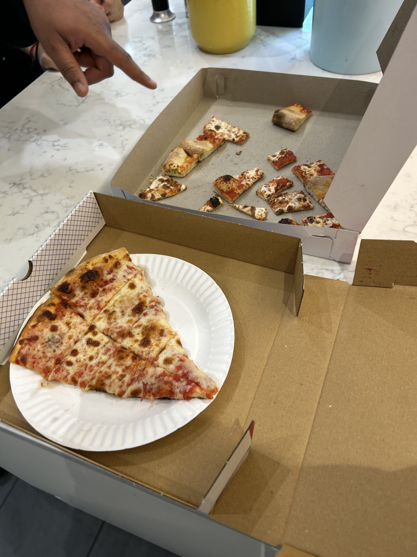 I am usually not one to karen out and write bad reviews on google, but with the service I was given today, I feel it's right if I do. So my colleagues and I decided to get cheese slices from both here and another pizza spot here in the mall. I asked both places to cut the slice into bite size pieces. The building blocks on the right was what I was given here. The guy who took my order was sweet, but the guy who gave me the order was one of the reasons why I won't be returning here again. I asked him if it was too much trouble to cut the slice (keyword: SLICE, this will be useful later on!) into bite size pieces, he asked if I wanted them "cut into 16th's" which I didn't understand at first because I asked for them to be cut into pieces. I reiterated what I said, and he didn't respond. So i waited for my order, and he called out my name. He said to me he thought I ordered a whole pizza, and accused me of not saying my order was a slice when I'm 110% sure I did. He said "i thought you got a whole pizza and not a slice, you didn't say that". So he cuts up the slice, and when we opened the box, since there was no plate, the pizza got scattered all over the box. Not what you expect when you open a pizza box. Before you say "well you got the slice cut up of course it's gonna break apart", yeah, but at least put a plate under the damn slice so it can stay in tact. Anyways, the guy has glasses and wears a cap, the pizza was a lame try at making a fancy pizza, and I will not be returning here again. The pizza on the left is from grisini's on the third floor food court, which was WAY better than what was given to me here. I can't believe I used to say this place was better than grisini's, but after trying them both side by side, I now know where to take...