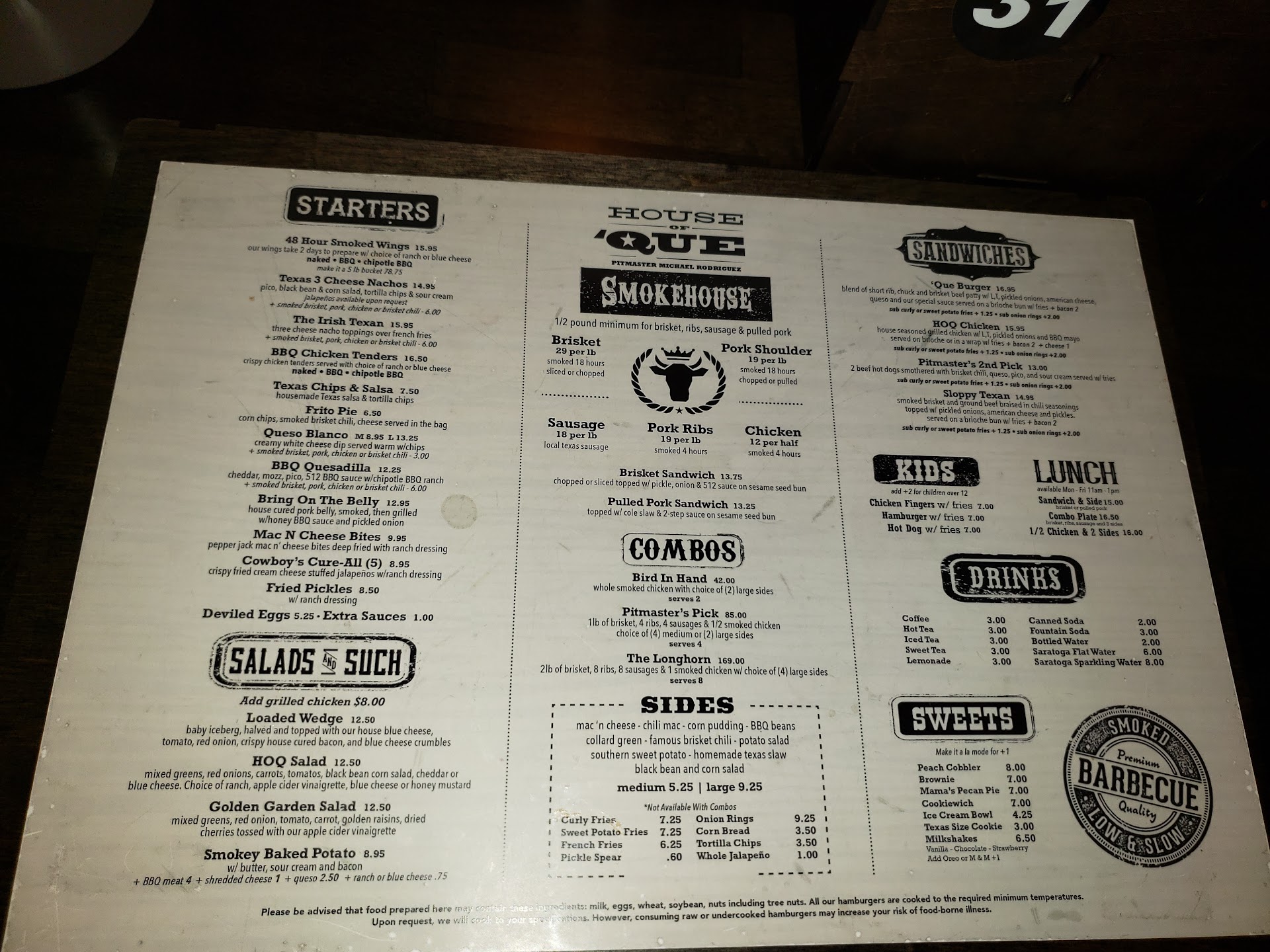 The food is not cheap I'm sure it's due to being in the American Dream. Prices for main dishes ( chicken, brisket, ribs ) go by half pound minimum ) for example: brisket $33 per pound - half pound minimum, so basically $ 15 per half pound then u order the sided and pay separately.