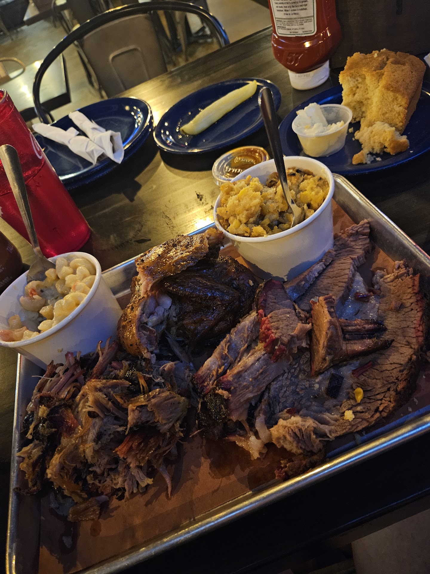 Texas sytle BBQ place .Went with 3 people. The chicken was dry and pink inside. Maybe smoke it a bit longer!!! , pulled pork was dry and flavorless , cornbread was dry. Everything DRY , and seemes like it was just sitting out in thr ooen air all day. We ate at 445pm, the on a saturday, thisbis prime time !!!!!