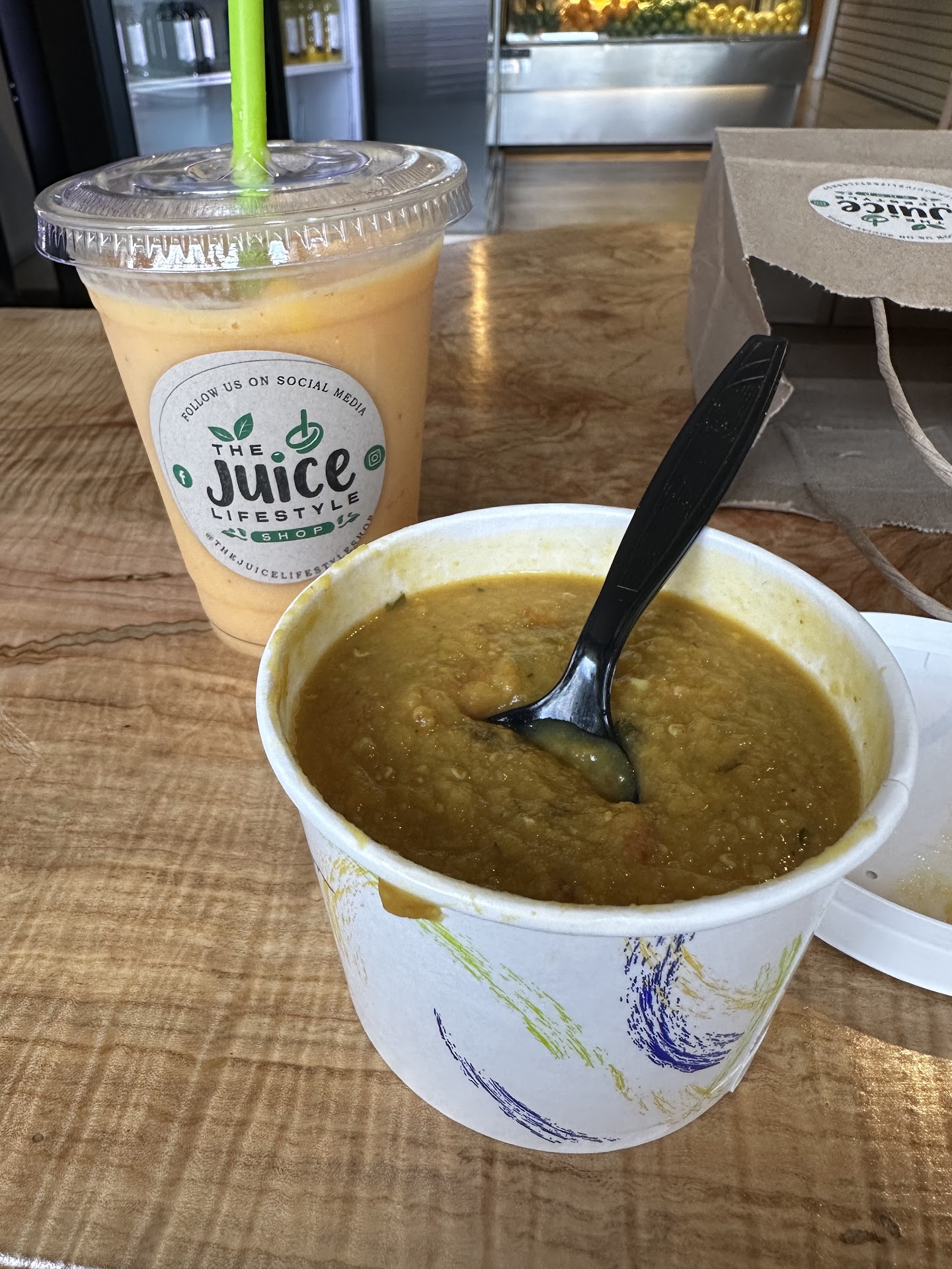 Read moreThis place was so delicious! It was my first time coming here I was in a mood for something delicious and light during my lunch break. I came across this place thought I should check it out and wow! My expectations were right on!!! I got the Caribbean smooth and it was sooooooo delicious!!!!! With their “ soup of the day” lentil and that was really yummy! The inside reminded me of a small apothecarium which was cool, they had different types of snacks, teas, vitamins, and other stuff. The only thing is they are pricy that’s the only thing that makes it kind of ugh but besides that everything is yummy and fresh!...
