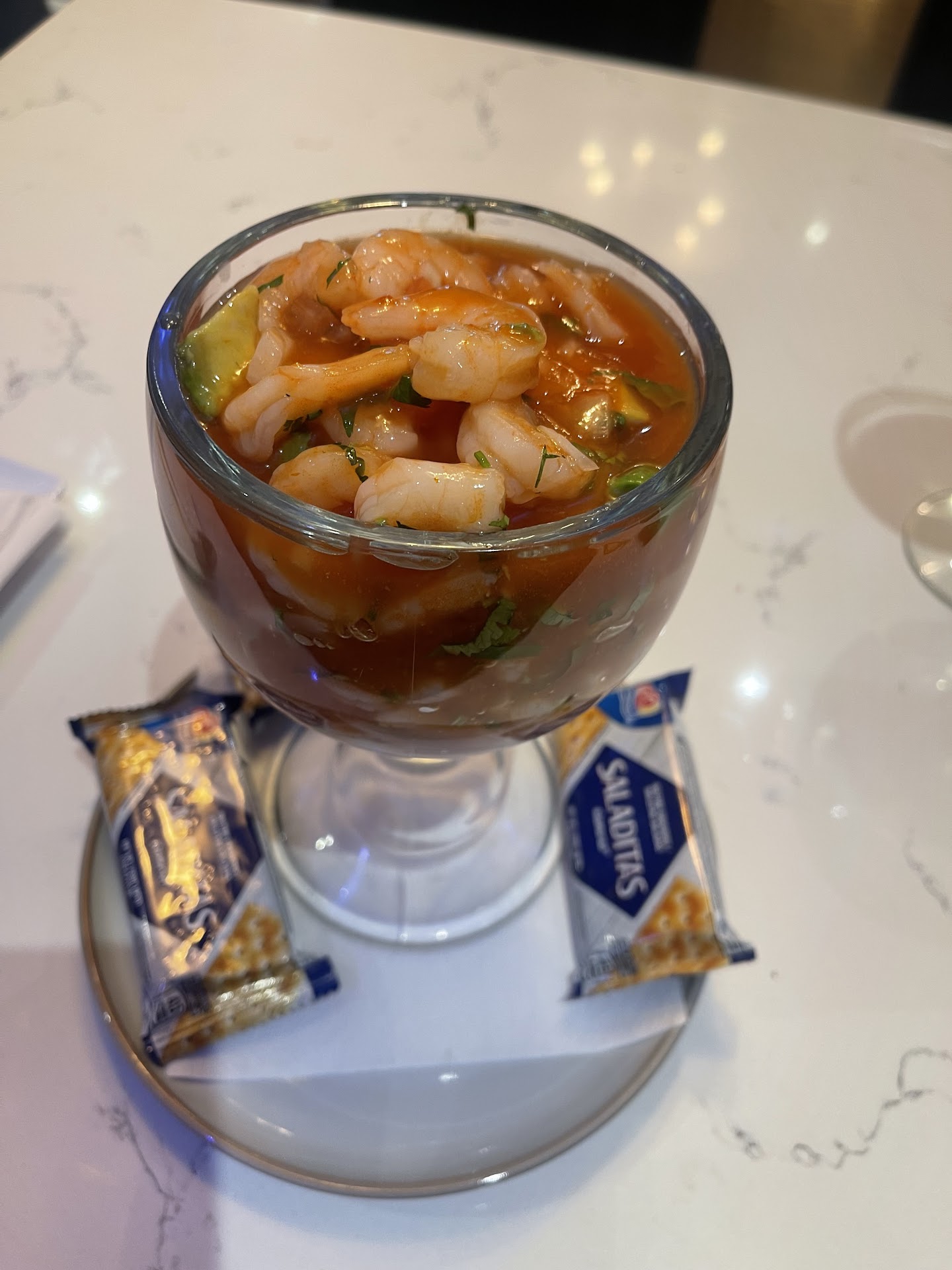 Read moreI had an appetizer called Cocteau De Camaron for the first time. It is huge! If I had a party I would order this for my guest. It is basically shrimp in tomato sauce. You really are supposed to spoon the shrimp on the crackers but I ended up just wanting a fork because the spoon is huge, it is really for plating on the cracker.