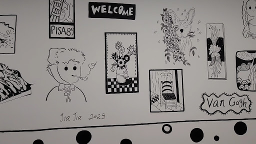This bubble tea and snacks place has a mural painted by the owner. It has variety of styles, executed beautifully.