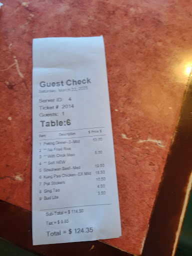 Read moreI havent been to Peking in a few years and wanted to have my fiance try it since he's never been, I will say the actual server was great and she did the best she could I think, with that being said I think there was some mis communication when we asked to sub a few items she stated there would be an up charge for the difference, not a problem... we ordered the Peking dinner thinking it's for 2 people since it states on the menu ( serving size 2 people) she explained we had to order 1 per person, so that was an auto $50 to start instead of $26.95,... she came back and confirmed the $5 up charge for 1 dish was 100% fine with... we get our food, which seemed to be way more them what we ordered... when she said I'll be back with more.... 😳 ummm ma'am what?! Fiance said it was ok. At least he gets to try 1 of almost everything... so the bill comes, and I'm looking at $124.... the cheapest thing on there was the 2 beers we ordered... this is rediclous and the menu needs to be updated and explained if you sub any items your gonna be charged for the whole dinner price not just a up charge for the difference also the wontons are not filled ones and are more like a fried chip...good food almond chicken was super bland..I also had 2 separate charges on my card this morning from them... so I will be reaching out about that... overall, I think the menu needs to be better worded so it's easily understandable on what you're ordering. I would have loved to be told that it would be the dinner charg and not just and up charg... the place inside hasn't changed in years, and the window blindes were covered in...