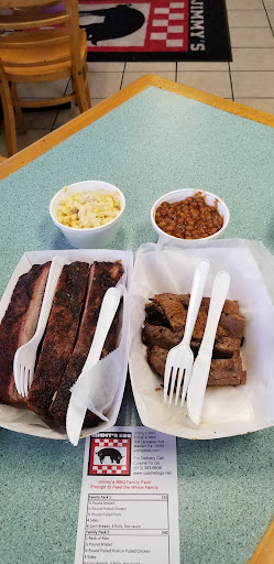 Read moreI’m a bbq fanatic and have eaten it all across America - especially down south where it’s the best! I also went to culinary school and worked in high end restaurants. I truly had high hopes for this place. The brisket was out of the world delicious!! I loved the sweet potatoes they weren’t swimming with seasoning to cover up the potato flavor - to me they were perfect. The Mac and cheese was pretty standard that was a hit. However, that’s where to good ends. The ribs were awful they didn’t fall off the bone you had to rip and tear just not a good cook on them at all BUT flavor was really really good. I ordered mild sausage but they gave me sweet (I’m not a fan of sweet so I didn’t care for it but if you like sweet sausage it probably was real yummy), the chicken was flavored very well and tasted pretty amazing but it was kind of dry. The beans seemed like they sat out for too long or something. Really thick and weirdly sweet. I personally wasn’t a fan but if you like your beans in a thick sweet sauce i can see how they would be good. I just didn’t care for them. As for the service it was a little weird. Not my preferred vibe from a staff. I did not feel welcome at all but there was a nice kid working the line and he kind of saved the experience enough for me not to just cancel my entire order. Jimmys is worth a shot if you like bbq - especially their brisket!!! but personally it...