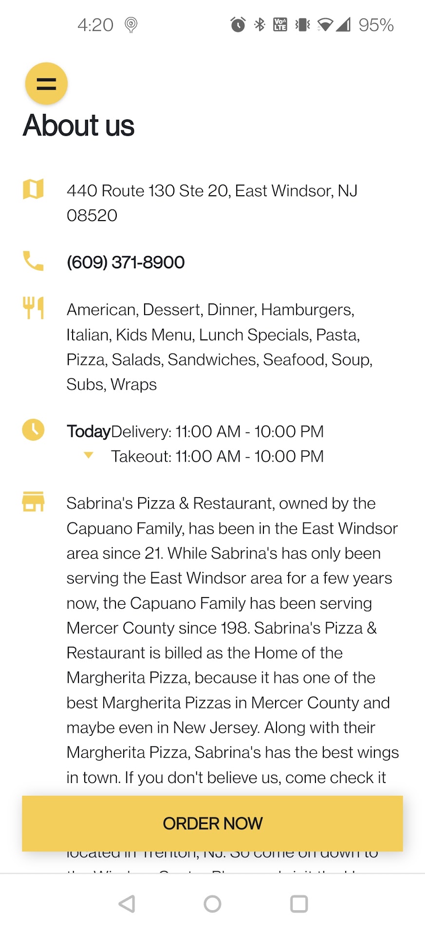 Read moreSabrina's Pizza & Catering is a must-visit for anyone who loves delicious Italian food. Located in the heart of East Windsor. this restaurant has a cozy and welcoming atmosphere, perfect for a relaxed dinner with family and friends. I recently had the pleasure of dining at Sabrina's and was blown away by the quality of their food. Their garlic knots with mozzarella cheese and marinara sauce is finger-licking good.
