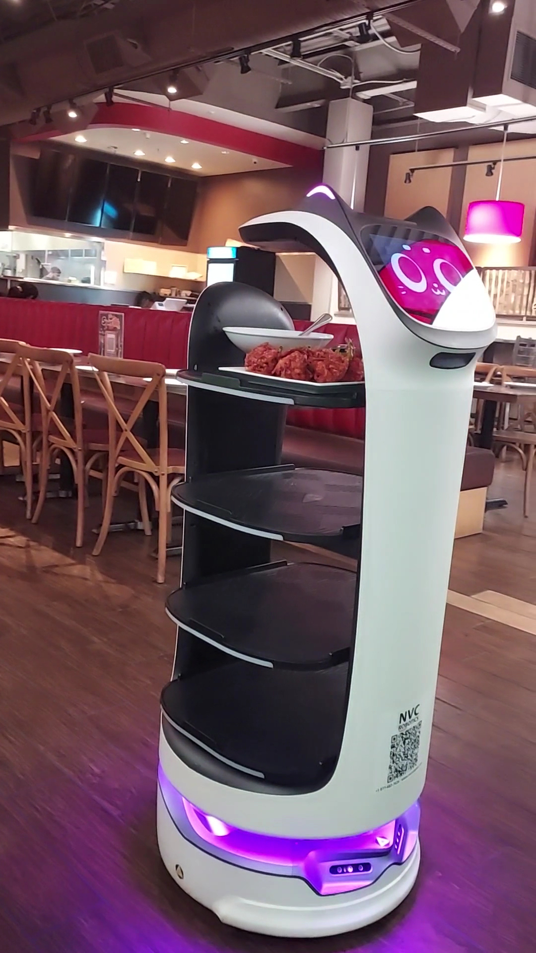 This is a casual Indo-Chinese restaurant with floor-to-ceiling glass windows, providing a nice view of the exterior. Orders are taken by a waiter, as normal, but the food is served with a robot server. The robot goes very slowly, so there's no reason to be scared of it. This place is great for families, friends, and large groups.