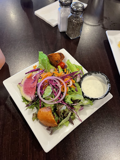 My wife opted for the Crab Bisque and the Fried Green Tomatoes, each priced at $10. I chose the fried pickles for my appetizer at $10 – perfectly breaded and fried dill pickle chips, served with a side of delicious ranch. For my main course, I selected the Cajun Chicken & Shrimp Pasta for $28.00: sautéed chicken and jumbo shrimp tossed with penne pasta in a creamy Cajun parmesan sauce, accompanied by garlic bread.
