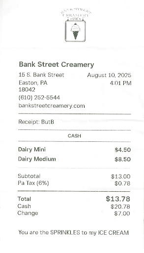 On August 10th, 2025, at 4:01 PM, We decided to stop by Bank Street Creamery for ice cream. The ice cream was excellent! However, I noticed another employee using gloves handling money, and then going to serve another customer a ice cream cone with the same gloves. I informed her it's against regulations to do so. I stated that you must change gloves and not handle food and money with the same gloves. She argued with me and said, "I can do that, I am allowed to use the same gloves!" Again, I told her that she was wrong, and I will never be back due to the disgusting behavior, and her snotty attitude, along with not caring for customers.