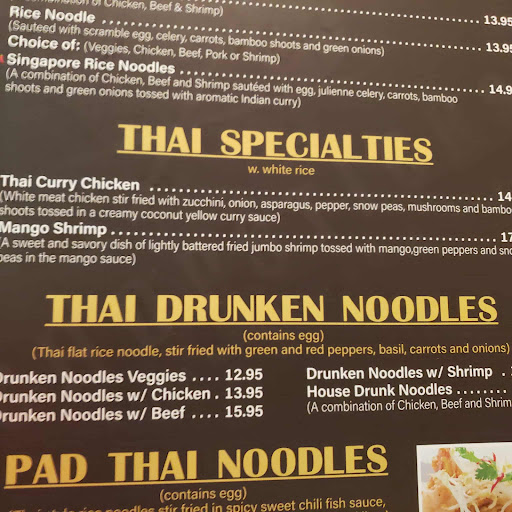 My favorites, so far, are the dumplings (steamed or lightly fried), egg drop soup, wanton soup, Mango Shrimp (big shrimp perfectly cooked/tender) Triple Delight, House Pad Thai, and...