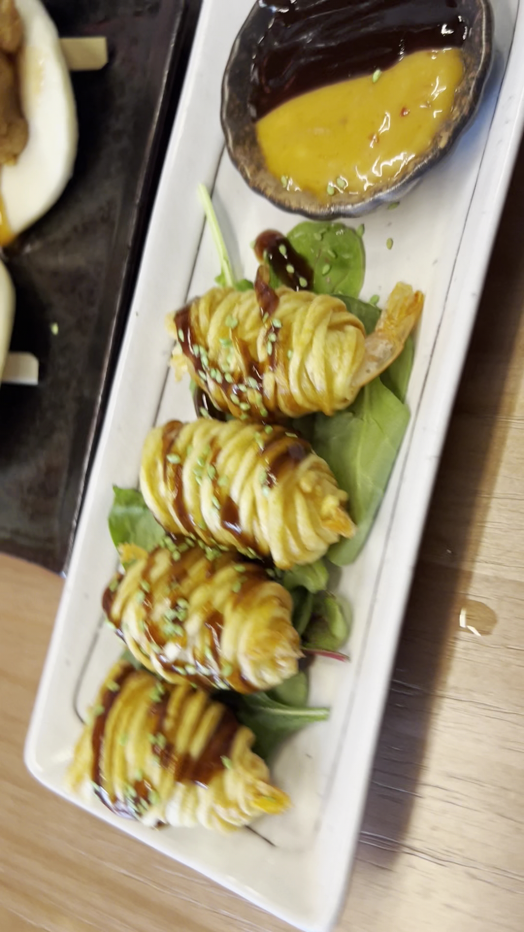 Atmosphere: The entrance features a stylish stone wall with a glowing signâvery on-brand. Inside, the vibe is modern-Japanese with high ceilings, colorful Japanese umbrellas hanging overhead, and a sleek bar serving draft beer and wine. A cozy yet trendy spot to chill.