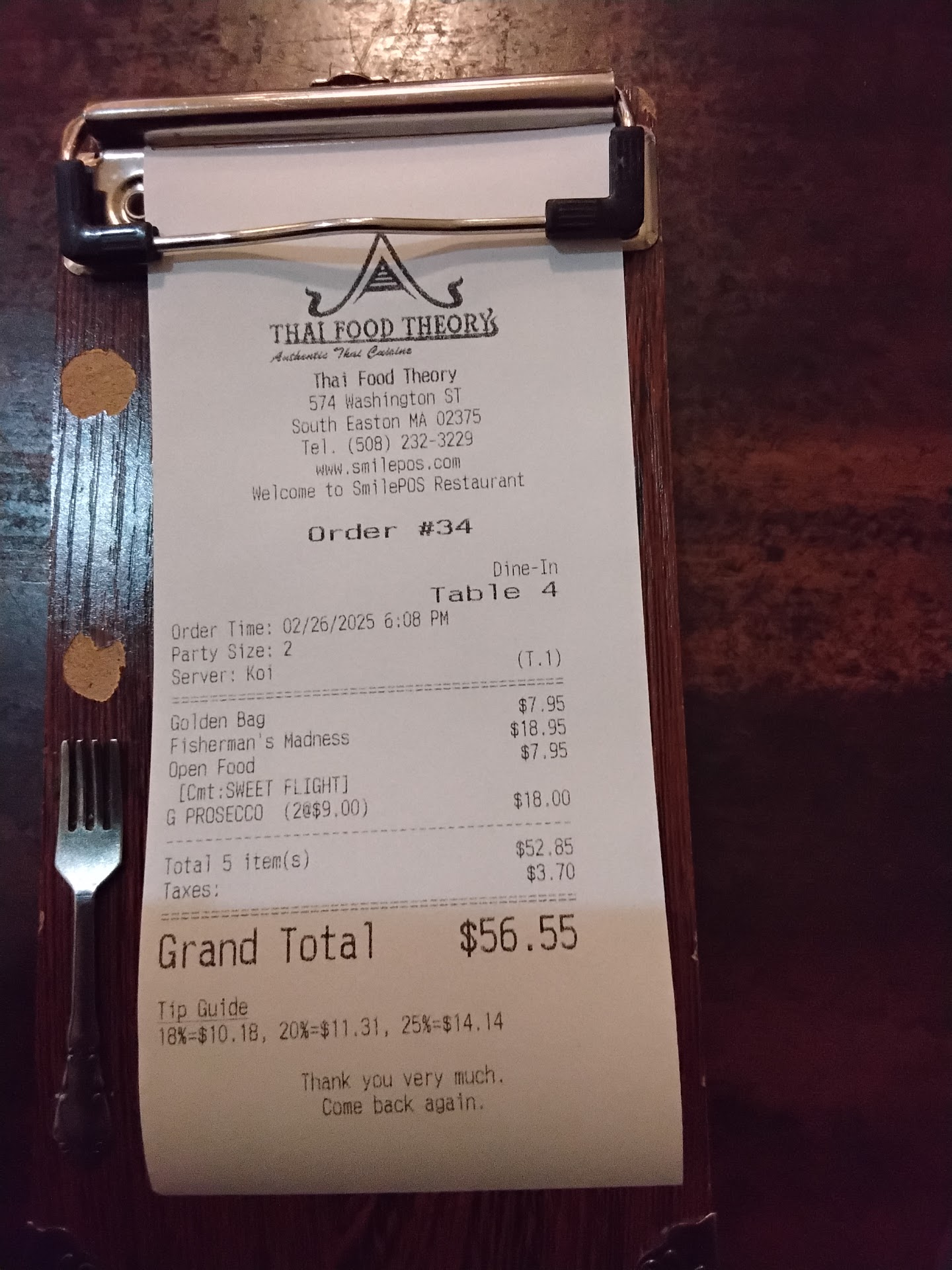 Read moreMenus were sticky stained, the drink menu worst of all. I started with the golden bag Appetizer these were crispy , delightful but a tad bland. I wanted to try the curry Puff so she gave me a couple, glad I didn't order, no hint of curry, again bland. Next I ordered. The " sweet flight" set of four non alcoholic beverages. Very lovely. Main course fisherman's madness, hot well mild lip sting, and was a bit watery didn't stick to the food. not a lot of flavor. Left the tails on the shrimp, tacky. It comes with rice at lunch but not with the dinner sad. Scallop ( there was 1) and squid were overcooked, while the green beans were undercooked... no atmosphere. Kitchen noise, plus 2 other conversations and the...