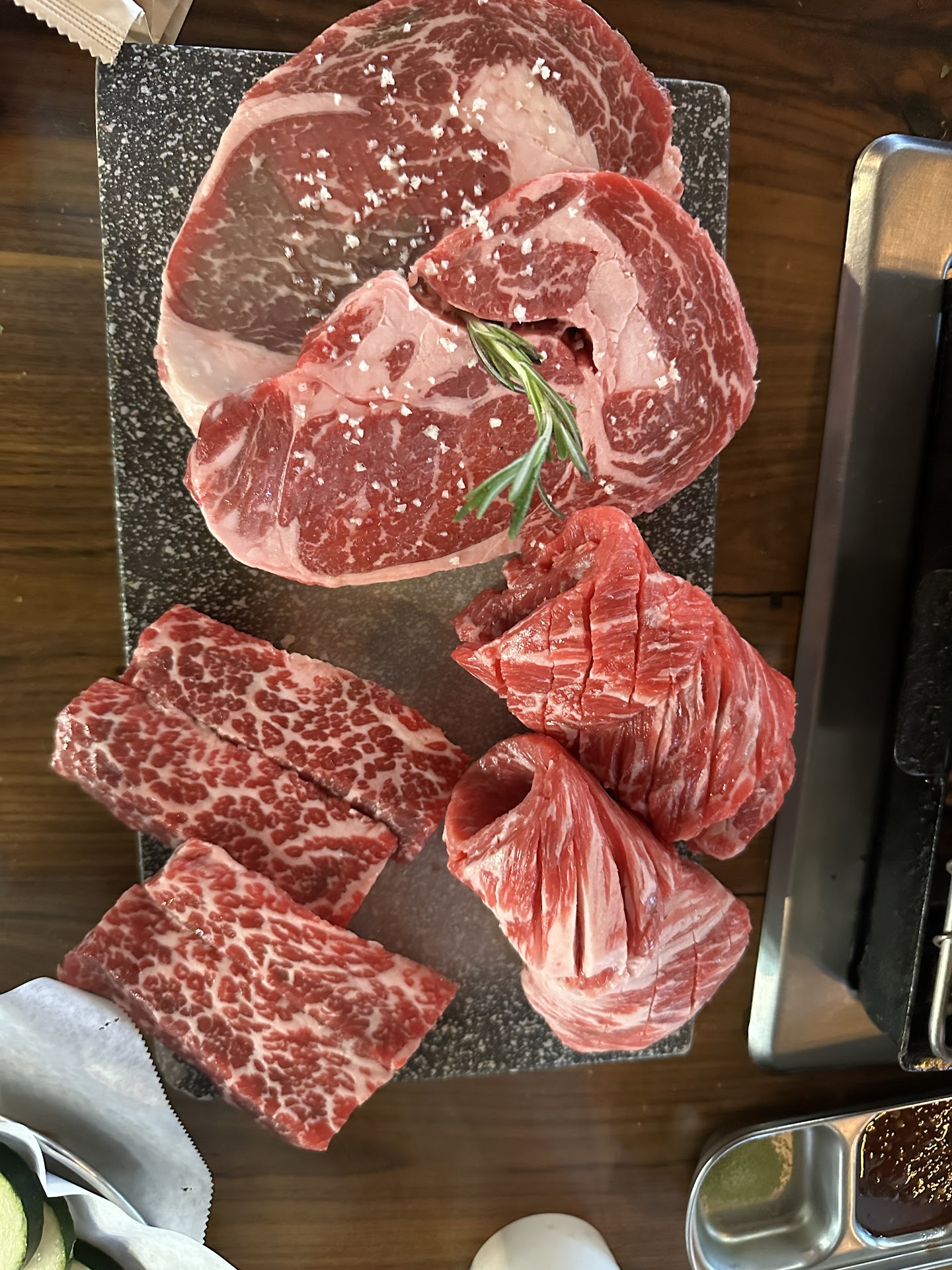 Read moreWe didn't do the Wagyu menu which was fine because their regular menu was pretty tasty on its own. The meats were pretty marinated so you can taste the flavors really well without having to dip the meat in any sauce. You have to order eat food item on your own because the only starter item they give you is a bowl of house salad. They don't have corn cheese, instead they have a cheese fondue similar to nacho cheese and not the super stretchy cheese and they have a cob of corn instead of stripped corn. The music choice is EDM instead of Kpop. There's a tablet in front that you use to sign up to put your place in line for a table. The vibe is industrial feel so expect exposed gas lines under the tables. The grill is a classic rectangular grill instead of the circle grill. The meat order came out pretty fast. They do charge kids by their height so anyone above 2.5 ft expect to pay $15 and kids under 5 ft is 50% which is common for more upscale KBBQ places to secure a seat. The only thing that didn't like was that the tables were too close so when the worker was cleaning the next table, accidentally got a mist of cleaning solution all over in our face and on our food but the grill should cook that right off.