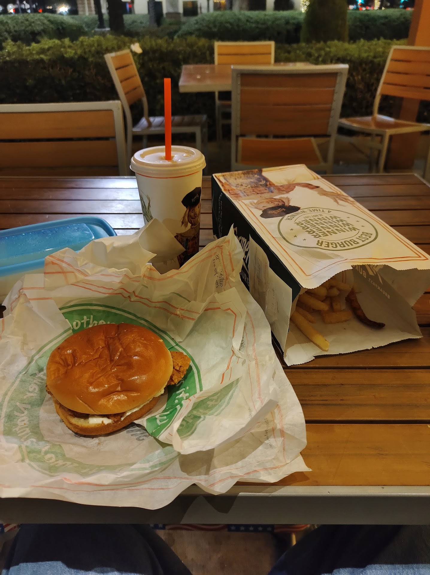 The chicken pattie was small and over-fried, comes with mayo and a couple of pickle slices. It tastes very plan. I love their burgers of which I'd describe as Tasty, Quality and Filling. This new Chicken sandwich has none of that.