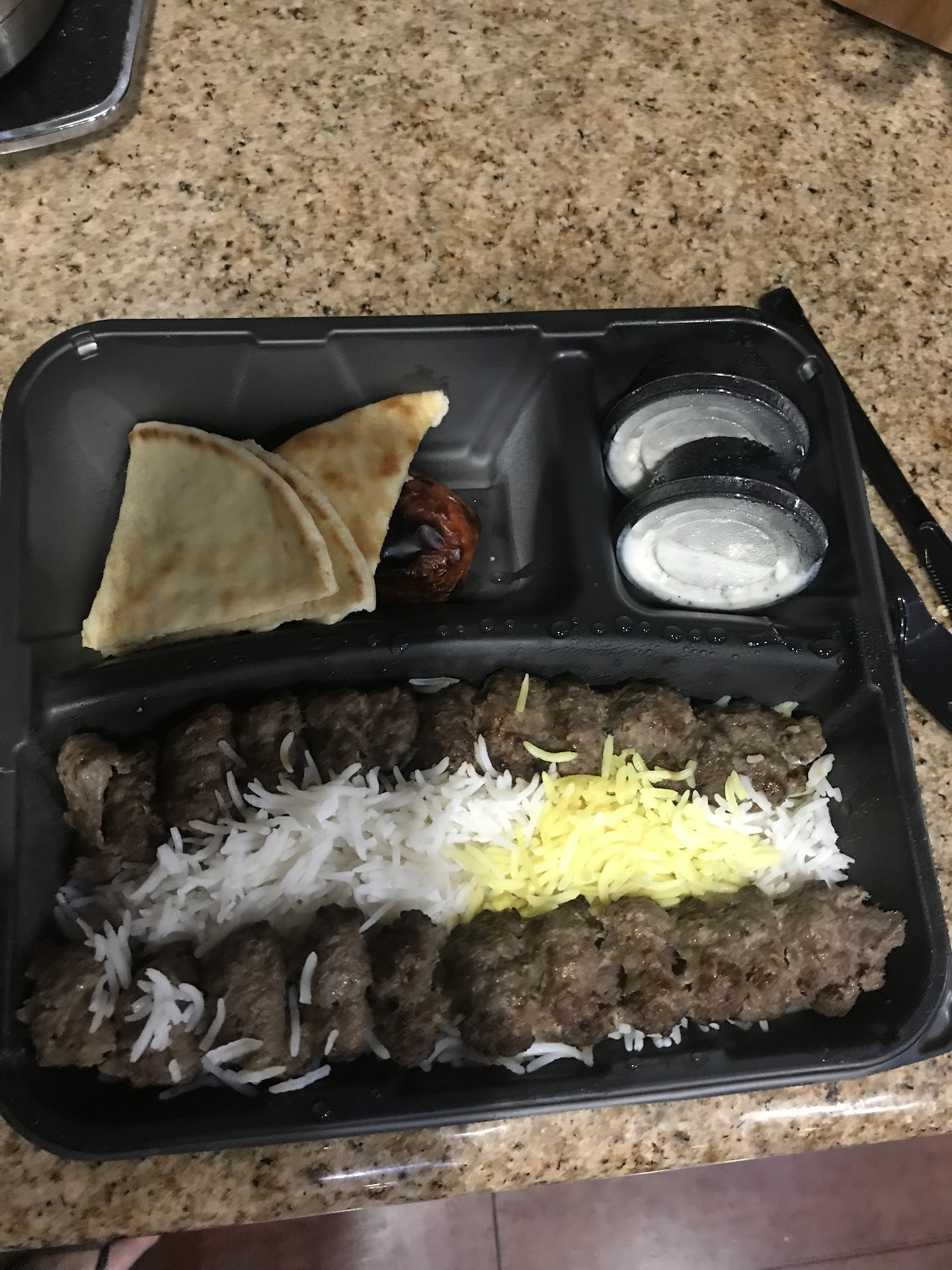 I had the chicken breast kabob. It comes with rice, salad, bread and small taziki sauce. Overall it was very dry. I wanted to add a ton of butter. The salad was from a bag and some pieces were yucky and brown. This is my biggest pet peeve. Turned me off from the rest of my meal.