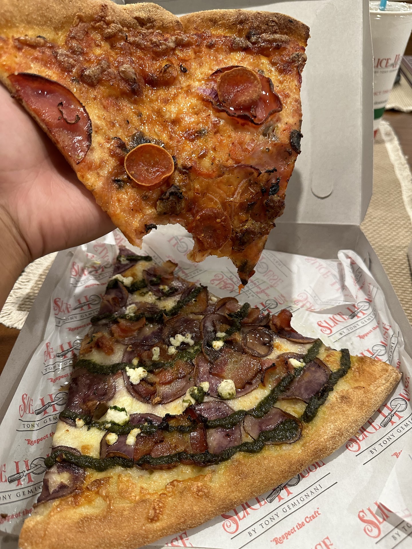 A friend and I were heading to AMC Burbank for a movie, and I figured it was the perfect chance to finally check out Slice House. One of those pizza spots Iâd bookmarked on Instagram ages ago. I usually hit places solo, so it was nice to tag-team this one. We ordered four slices total and split everything: