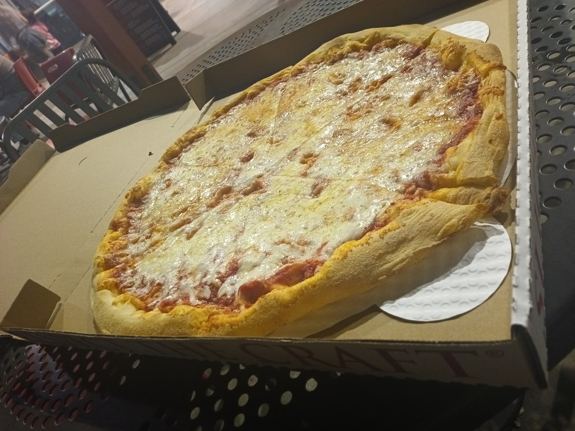 I included a photo of the undercarriage of the remade pizza ... It was literally doughy and you could peel and stretch pieces of the bottom, the finished pizza was like a dehydrated dough that still contained some hydration content. Obviously not consistent with the namesakes product, and if you can't maintain those standards (or treat customers with basic decency and respect when this is brought to your attention) then this franchise will quickly go the way of any mall food court pizza, which is a shame ... "Respect the craft" is right on the box