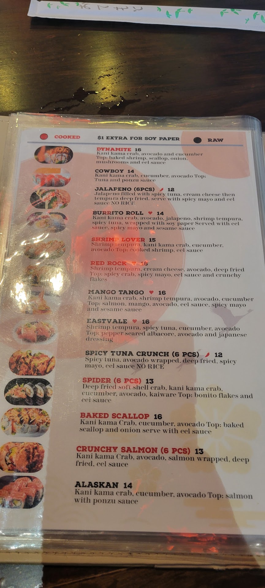 Read moreA bit of a late post- I didn’t know what to expect when I arrived at this charming little sushi joint, but I was pleasantly surprised! We arrived during happy hour, which is conveniently offered most of the day from Monday to Thursday and even longer on weekends. Just in time at 6:30 PM, we took advantage of the great timing. We ordered six rolls along with a large Sapporo: The Red Dragon, Rainbow, Jalapeno, Spicy Tuna, Crunchy Salmon, and OMG rolls. My favorites were definitely the Rainbow, OMG, and Red Dragon. Each roll was delicious, and the extensive menu means I’ll definitely be back to try even more rolls. Missing star because the other rolls were just mehhh like not good at all and the...