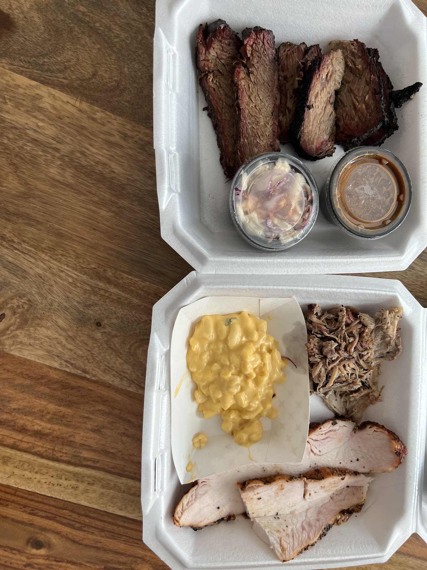 In all honesty I’m not an expert or anything so just my own taste I feel at $85 I spent on the loaded Mac n cheese with brisket and the loaded corn with cheese and brisket. My sons brisket kids sandwich A three meat meal two drinks and an extra sausage. Let’s just say the coke and fries were the ONLY edible things my family chewed on. The owner was great and understood and immediately wanted to refund but I support small business but food quality it just wasn’t there really fatty pulled pork which came after everything so it literally looked like fatty pile of cold meat, one sausage was like a tannish color that tasted like a hotdog, the hatch green chili sausage had zero flavor, the coleslaw zero flavor except the seasoning that was sprinkled on top . Baked beans tasted like ketchup with brown sugar on canned bean, brisket was decent just crazy fatty more fat than meat. The loaded cheese corn and Mac was probably the worst I’ve ever had . The Mac and cheese at least ours was orange color. And the corn tasted like canned corn with government cheese on it. Again my own experience maybe on this Monday it was just off but I was not at all liking any...