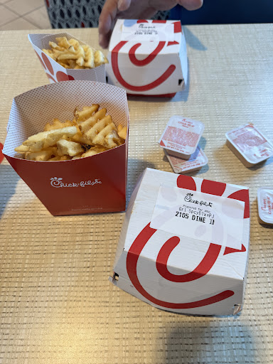 Read moreYesterday I had one of the most unpleasant dining experiences in my life at this Chick-Fil-A. Literally all five of my senses were assaulted. Sight- every single table in that place was dirty. Literally, every single one. The tops of the tables were gross but the mess under the tables was repugnant. The place clearly hadnât been cleaned in hours. Smell- I smelled what I thought was barf but it could have been a disgusting rag used to clean the tables whenever they were last cleaned. Hearing- an off shift employee was listening to something on her phone literally at top volume with the speaker on. This lasted about ten min. Feel- sticky table and sticky floor. Finally taste- we ordered on the app to expedite the process and when I asked about why the food was taking so long (about 20 min since we arrived and finalized the order) they did not know why. An employee then took two bags off the counter where food prep was occurring and handed that to me. The ticket on the bag said the order was completed 15 min before I asked about it and sat there getting cold for that whole time. Corporate really needs to investigate and review this place and the franchisee. Whoever that person is, they are giving the company a bad name and it was overall a terrible...