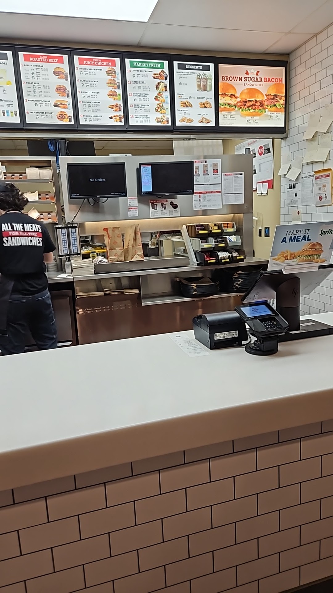 April 26th at 1:30. i was disgusted by the dirt. The floors during rush hour maybe but the sauce dispensers were caked on and sticky, the counters had dried on spills. the tables were gross the chair backs were sticky, i didn’t dare go into the restrooms. the rush hour i saw was three table of people plus me and 3 standing customers. i stuck to the floors around my table. there was trash on under the tables and booths. maybe 2 bus loads of customers had just finish bit i don’t think so. i watched as the 3-4 staff stood around chatting with family/friend of one of the works - one of the tables during rush. don’t know what was hppening at the drive through. there seemed to be no way of getting order except to wait by the ordering counter until your order was up. i like products at Arby’s but .... gross Dispenser for cups was lost empty and dirty with crumbs bd dried spills. the straw container was in the same condition. i tried to call the number posted on the door to reach arbyscom but they wanted the store number found on my receipt which i had thrown out and i wasn’t about to dig in the garbage for it.