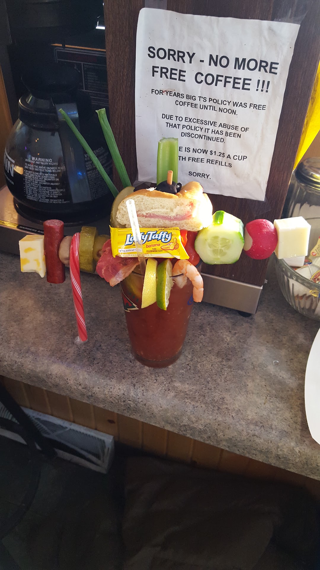 Read moreWent for the Bloody Mary and was not disappointed. Holy crap. Amazing. In the bloody Mary game, overkill gets the points, and Big T's does this in spades... I happen to catch it on a quiet morning, so it was an enjoyable and relaxing experience. Tried it a second time and it was pretty busy, so had to put up with that hustle and bustle. Not a deal breaker for me, but I do love a "quiet" dive bar... Certainly a non-issue for most patrons. Being busy pays the...
