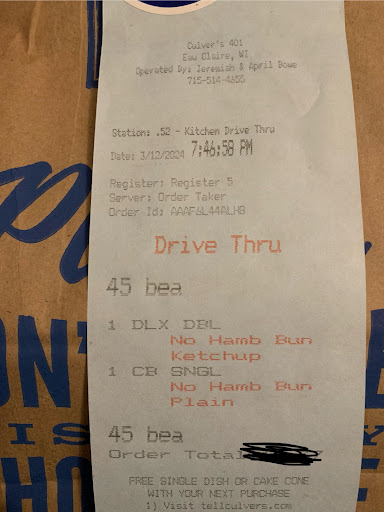 Culver's #401 In Eau Claire, WI. On Gulf Rd. I want to give the Manager and staff for a generous gesture on Friday 02 August 2019. On the said date, I arrived at the store prior to a Doctor's appointment, after placing my order and driving up to the window, I realized I had forgotten my wallet back in Wausau.... I felt terrible and told the cashier I needed to cancel my order, the cashier looked at me and asked me to wait a minute, and returned to me stating the manager had taken care of my order and gave me an order number #67. What makes this even more special is that I had ordered two double cheese burgers for my dog... THANK YOU FOR YOUR SERVICE AND YOUR HOSPITALITY!!! I will be send you my receipt along with the amount and some gift cards to pay it forward... Thank you so much... Very truly...