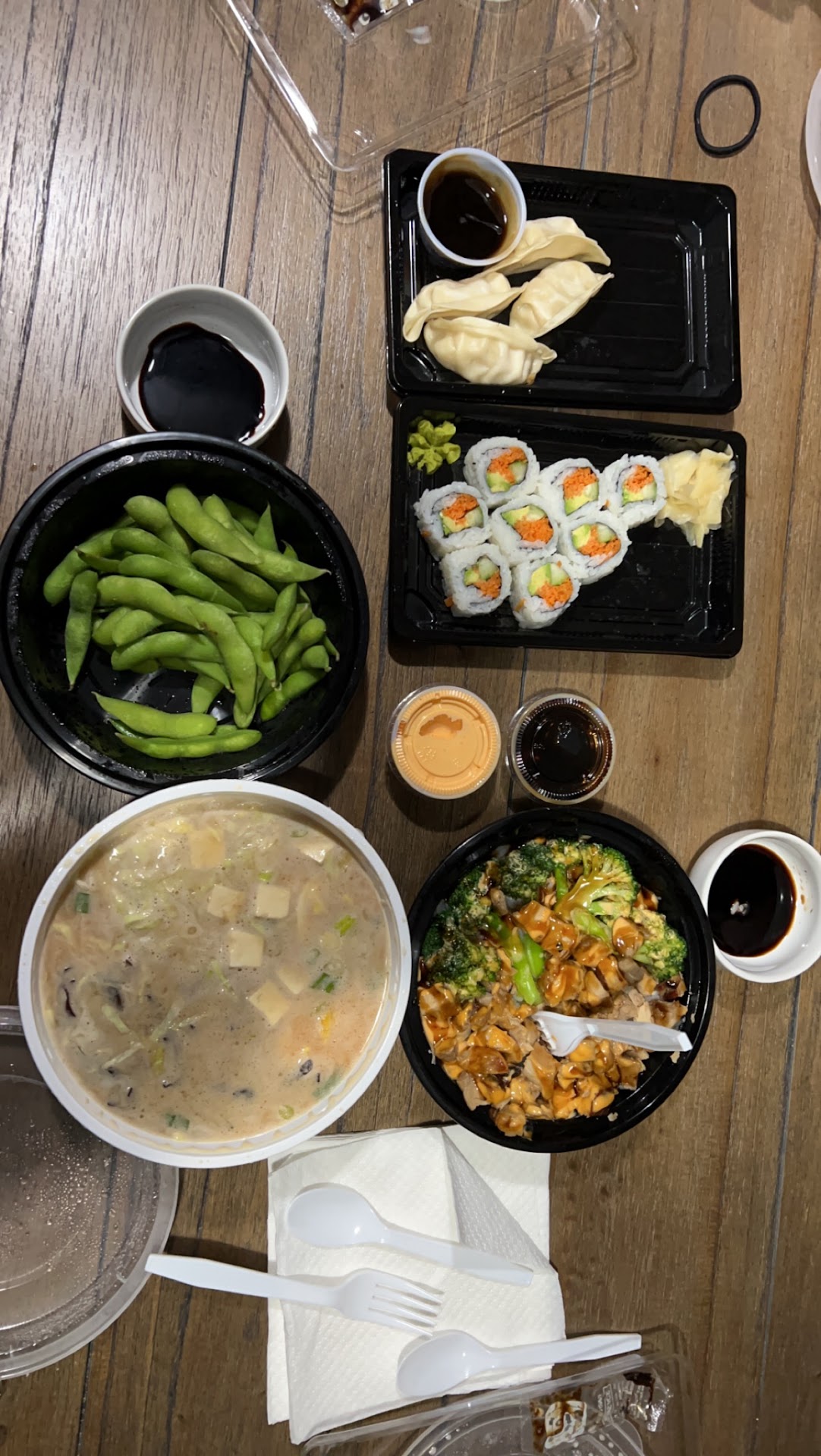 came here on valentine’s day, there was only one younger guy working, when we walked in there was one person sitting & eating. The worker said he’s really busy with online orders and we have to wait to order, there ended up being a line behind us. When he finally took our order after 20 mins he said it would take another 20 to make. When we asked questions abouthe menu he couldn’t answer them and didn’t have much menu knowledge. Our edamame had no seasoning on them at all (not even salt) 2/10, the chicken teriyaki bowl was 2/10 also they didn’t have white rice so had to use sushi rice, and the chicken was absolutely foul, grossest looking chicken ever. Was expecting the ramen to be alot different but the flavor was good, the broth was just different than usual. Vegetable sushi was not worth it at all, The dumplings tasted like microwave ones from the grocery store...