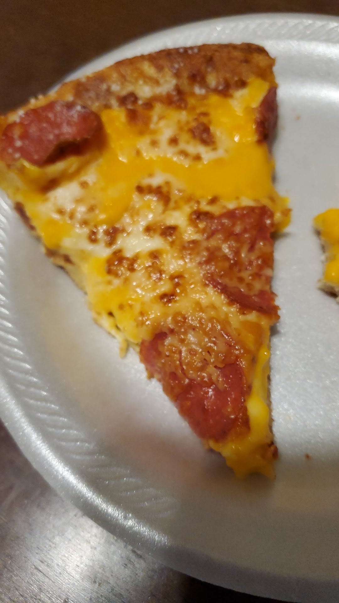 Read moreUsually we get awesome service & pizza but unfortunately this time it wasn't for either. Went in at 4 pm. Waited 10 minute for a worker to wait on us. There were 3 of them working. Was told at 4:15 that our 2 pepperoni pretzel crusts would be ready in 15 minutes. Finally got our pizza 25 minutes later. Got home with our pizzas to find they were not cut and had so much cheese sauce on them that the cheese & pepperoni toppings just slide right off. Mind you we live 25 minutes away so i was not taking it back to have it made correctly. I want to give them a 1 star but I can't because we love the pretzel crust pizza too much. The picture added is the slice that the toppings didn't manage to fall off but you can clearly see the excessive amount of cheese...