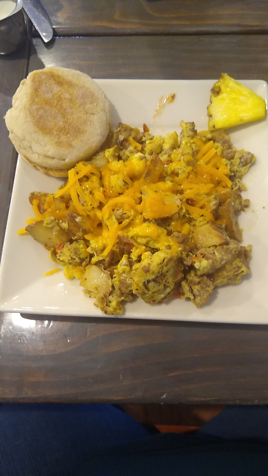 You order at the front counter and pay first, then recieve a number for your table and then later, your food. You must grab your own silverware and fill your own drip coffee. You can find creamer and jelly near the silverware station. The butter was behind the checkout and we had to ask for it because our pancakes did not come out with any, although maple syrup is on the tables. You also bus your own table when finished. These steps might not be obvious to newcomers, we stumbled through them but we also assisted by local patrons who knew the ropes. Food was delicious with great variety on the menu, cafe and omelet foods and great coffee. Food is a bit pricey and with tip it's a little overwhelming being that you do a large portion of the table work yourself, including grabbing your own drinks. They will bring your food out to you to 'auction' it off (ask everyone who ordered what) so make sure your seated between trips to properly stock your table so the server can get the plates laid down correctly. Great attitude from the folks there and smiles and great service, good food. For large parties, it would help with problems in flow by having a server help stock the table so that people aren't required to wander through the dining room on top of the others carrying two drinks at a time (this is where it may be great for some professionals who can come out with a tray!) The lobby had a nice line and it felt slow to break through the line to travel between the silverware and coffee station and back to the table, but we made it. An explanation of how to order would be helpful to new folks, for some reason it was not obvious we were expected to grab our own things and bus the dishes from our own table, but we made it somehow. We came at a busy time, but this is a cozy place with local charm. Bathrooms were clean and restaurant was well stocked, bustling, and upbeat. Great coffee, I loved the choices. Beats any fast food joint hands down. We...