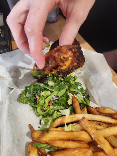 When we started to dig into our food my partner and I found burnt pieces. My partners fried chicken was burnt crisp, amd her bun was completely charred inside. So much that she even tried to scrap some of the burnt ash off of it. My nachos were barely topped with the abundance of toppings the menu offered. The queso cheese was cold on top and a bunch of the chips on the bottom layer were burnt at the edges and corners.