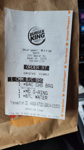 I do like Burger King, but not this one or the one at the Beaver Valley Mall. They are rude. The drive in always plays that stupid WELCOME message trying to get you to buy an item they are featuring. I HATE THAT!!!! They do not take coupons printed even from the Burger King site online... just the printed ones you MIGHT get in the mail or the Burger King app ones. They are stingy with condiments and always seem to forget adding napkins to the bag.