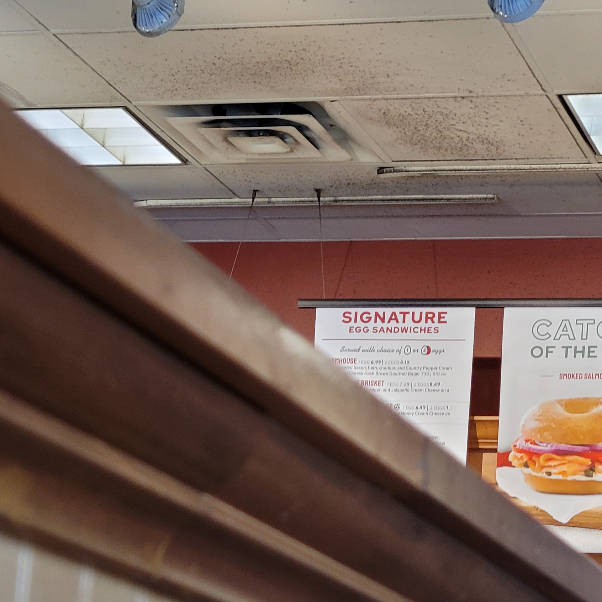 Worst Brueggers I have ever stepped into. Absolutely filthy floors and filthy everything... Was in line to order, just wanted 3 Herby Turkeys. Was told to wait a moment as they finished an order. I said sure. Then was asked what I wanted...2 Herby Turkeys with 1 type of bagel and 1 with another (oh and they had only about 3-4 different types to choose from at the time, most were sweet so those were out, so only sesame or olive oil). They after asking us what we wanted, guy goes back to making another order. 3 minutes later he asks me again what I want...so I tell him again. 4 minutes later he asks again, and I indicated I have told you twice now but I will say it again, which he tells me he has no turkey. At this time I see a girl come out the back and depositing more bagels. After he comes back from the back of trying to find turkey, I ask him what bagels she is making, she again tells me what is behind him is all they have. I get my order and sit down, 2 of them have no onion in them. Go back up and he tells be Herby Turkey do not have onions, which I tell him he may want to read again what is in it. So he gives me onions now. In that time I see that the bagels that I asked for are now being filled in behind him which I wanted an Asiago but informed me they dont have it. Whatever, I sit down to eat and am surrounded by absolute filth on the floor, ceiling, tables, everywhere. I included all this info with the hopes that corporate or the owner will have a more detailed version of my visit which I will never come back to. As I left I was telling people they should definitely go to a different location or buyer beware....wow, is this what things have come to...