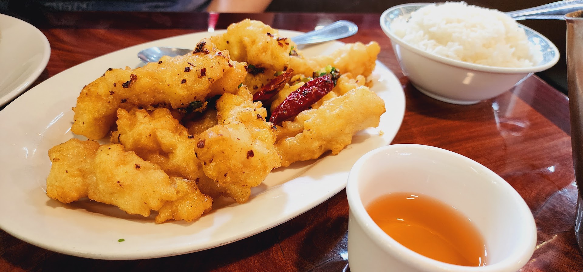I ordered the Seafood Pan Fried Noodle, which is a classic Cantonese dinner noodle entrƩe. This is the very dish where the American Chow Mein was based, except it's 100% better than the American-Chinese version in it's authentic form. They stir fry lo mein egg noodles, and quickly dip them into the fryer to get the edges crisp. They then put a simple stir fried mix, in this case seafood (prawns, squid, and large tilapia filets) with veggies in a classic garlic white sauce, and pour it on top of the partially crispy noodles. The result is a mix of yummy saucy with a little bit of crunch.