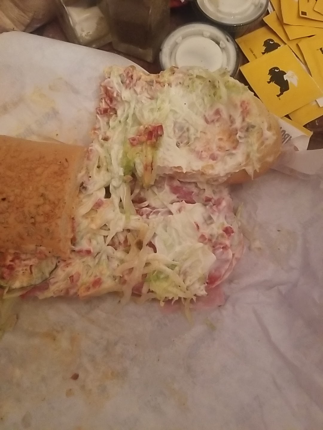 Read moreI don't consider myself entitled, I like to think I give people the benefit of the doubt every time, however, blatant incompetence, over very basic procedures? I see that as a lack of training, or the management working their people in inhumane ways, like clopens (close shift, then opening shift the next morning)or just not caring by the employee. I went to this location, hoping for the normal experience where I get my food and leave, with no complaints or problems, but, I asked for Mayo, then extra relish, the guy slathered the top with relish, forgot the Mayo, then put at least a half a cup of mayo on top of the relish, the sandwich is inedible, it's more mayo than any other topping. I also asked for a half cut instead of quarters, 5 seconds later the guy cuts it in quarters, when I had asked him not to less than 10 seconds before. I will be requesting a full refund or 2 new sandwiches, not made by an ignoramus. 50 DOLLARS for 2 mounds of slop is...