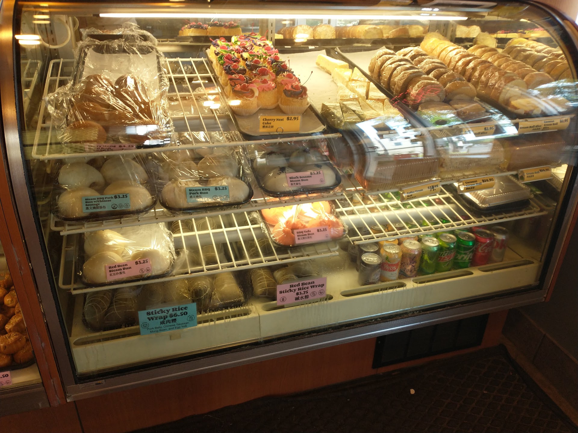 Pictured Display case Display case (Top left clockwise) Bbq pork bun, red bean sesame ball, steamed red bean bun, steamed bbq pork with Chinese sausage bun Steamed bbq pork with Chinese sausage bun ($3.25) Steamed bbq pork with Chinese sausage bun inside shot. Filling amount can be hit or miss as my friends one had very little. Steamed red bean bun ($3.25) Steamed red bean bun insides Red bean sesame ball ($2.95) Red bean sesame ball insides Bbq pork bun ($2.95) Bbq...