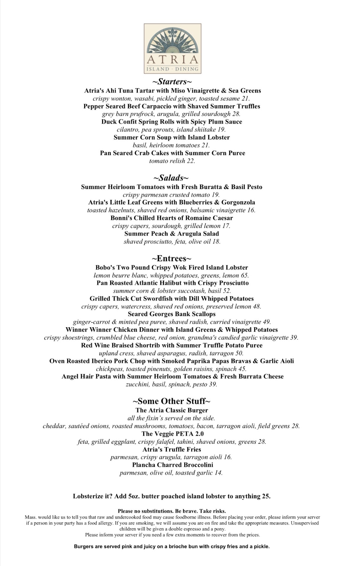 Read moreAtria is classy flavor forward quality focused & intriguing take on dinner classics & new offering right in downtown Edgartown at 137 Main St, Edgartown, MA 02539.