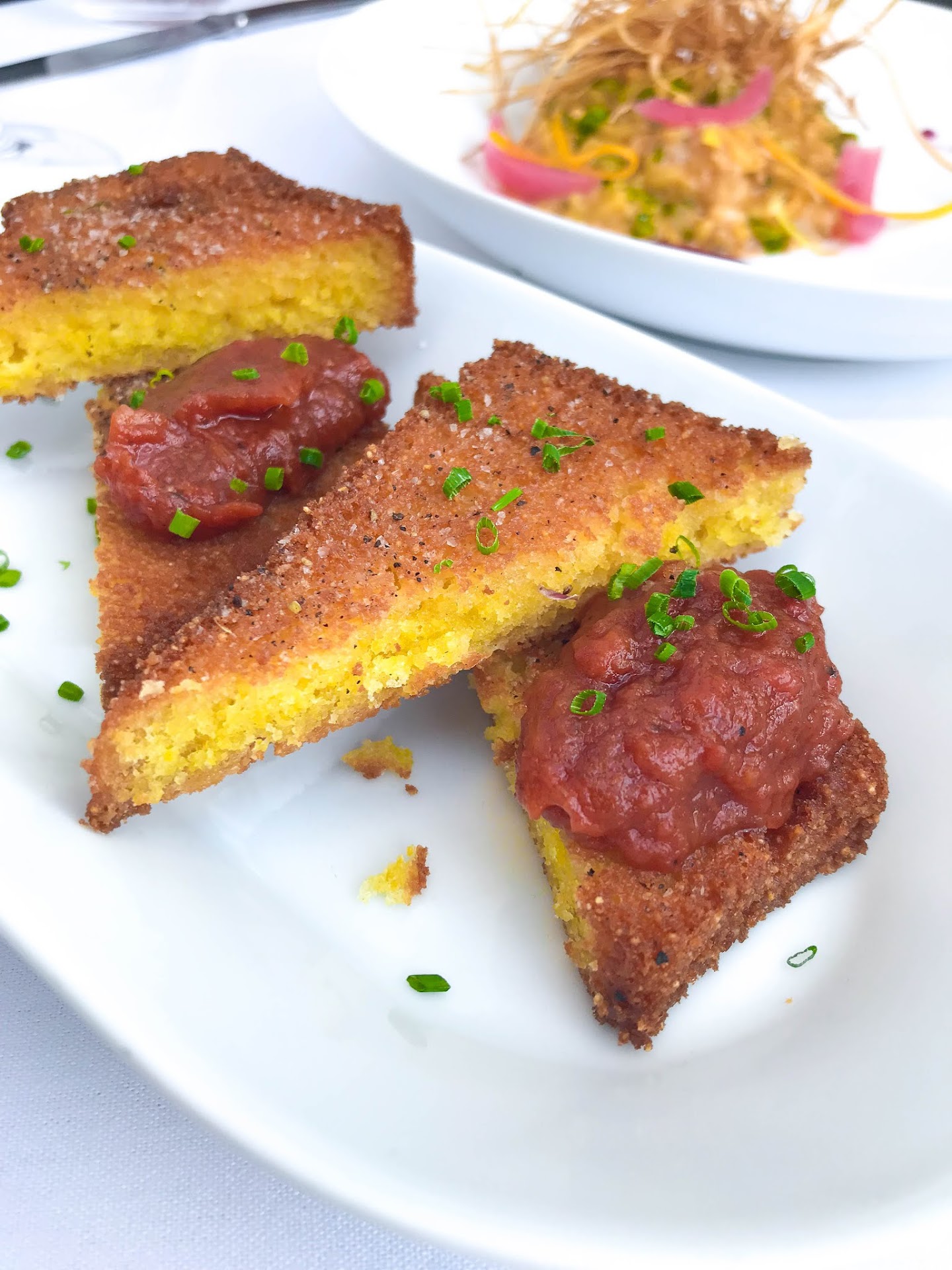 The food, created in one of the smallest kitchens I've ever seen, is the stuff dreams are made of. No joke, from the freshly baked potato bread and ricotta spread with local sea salt, to the fried cornbread starter to the salmon entree and the panna cotta desserts, nothing disappoints. It's elevated food that's not to "prissy", it's food that has so much flavor and color that it makes you happy when it comes to the table.