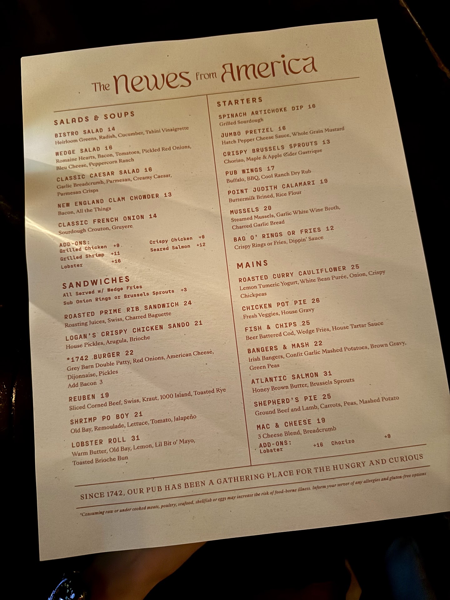 Been going to, and taking out from Newes Pub for years. This experience was by far the worst. Chowder was as thick as paste with the overpowering flavor of bacon. I loooovvveee bacon...so that's telling that the Chowder was not enjoyable. My meal got worse and worse. My bag-o-rings were overcooked on the outside, but the batter was raw on the inside. Maybe they had something going on with their fryer tonight, because the fish and chips were just as bad. I literally sloughed the entire batter/coating off my two small pieces of fish before eating them. The chips were not crispy either. I've heard the place had gone down hill since Faraway took over. I didn't want to believe it, but it was plain bad. Plus, $50+ for fish n chips, onion rings and chowder is expensive. I also opened the entrance door right into the back of a pair of young ladies waiting just inside...the staff must not have been paying attention to escort them away from the inward swinging entry door. When i carefully made my way in, I tried to scoot over into the front bar area and I kicked a small space heater that was under foot right near the entryway. This is a historic building and I was floored to see a space heater with glowing red hot heating elements being used inside. They've had fires there before...this is just tempting fate. They couldn't pick up a ceramic space heater? A fire in a fireplace is one thing, but having electrical space heaters is...