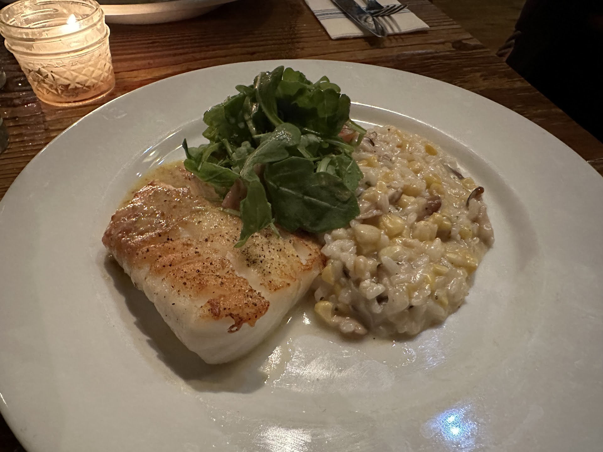 Overall, the food was very good. The buffalo brussel sprouts with whipped blue cheese were very good but for $18? Feels steep. My husband enjoyed his tuna, which was served like an elevated poke bowl and had Asian influences. I got the seared cut cod special, and enjoyed the sweet corn and mushroom risotto that came on the side: it was appropriately warm and cozy feeling for the rainy day, and brightened by the bursts of sweet freshness...