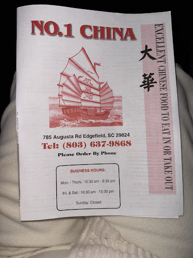 Read moreMy brother and I traveled to edgefield s.c to pick up a plane. Stopped in NO 1 CHINA RESTAURANT. I ordered beef and mix veg, BEST BEEF AND MIX I ever had in my life. Big portions not salty at all, chunks of large bamboo. I will travel to Edgefield just to eat here. Nice to taste great food! So impressed! I wish I had some right now. Next time I'm ordering large plus extra bamboo! Thanks for making my day. Other chinese restaurants need to eat here and learn how its really done....